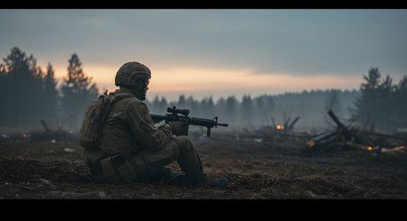 A detailed image displays a modern rifle featuring a scope, resting on a bed of foliage. The composition showcases a dark, textured style with warm tones and soft lighting. The setting suggests an outdoor environment, possibly a forest, implying a potential use for tactical or educational content.