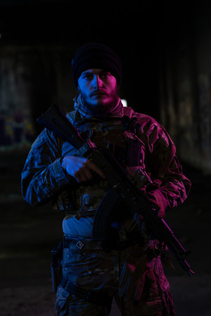Army soldier in Combat Uniforms with an assault rifle and combat helmet night mission dark background. Blue and purple gel light effect.