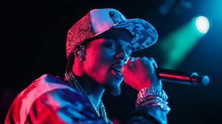 Rap artist performing live on stage with colorful lighting at an indoor venue