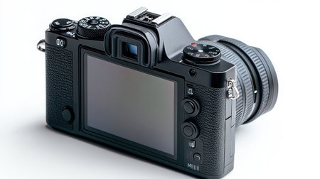Black mirrorless camera, buttons and blank LCD screen in focus, side angle, isolated on white background, sharp product photo