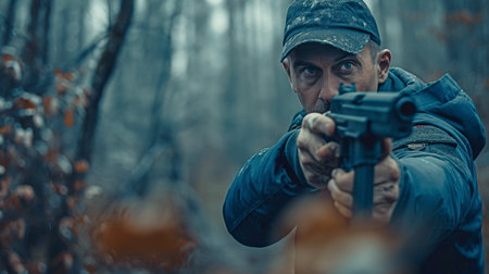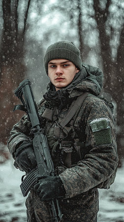 military man dressed in winter camouflage poses with a firearm in a snow-covered forest. The soldier appears focused and ready for action amid the cold atmosphere.
