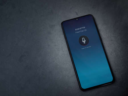 Lod, Israel - July 8, 2020: Miri app launch screen with logo in hebrew text on the display of a black mobile smartphone on dark marble stone background. Top view flat lay with copy space.