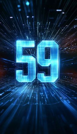 Glowing Blue Digital Number 59 on a Futuristic Technology Background with Light Trails