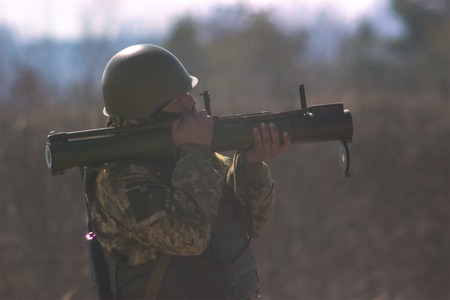 Zhytomyr, Ukraine - March 5, 2015: Military soldiers at tactical exercises with guns