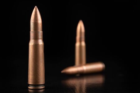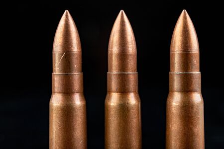 Bullet on black background. Rifle bullets close-up on black back. Cartridges for rifle and carbine on a black.