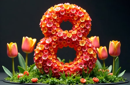 Volumetric figure eight made from small flower buds on a black background with tulips. International Women's Day. Mother's Day
