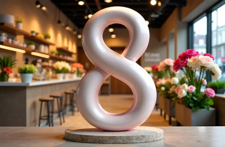 Volumetric number eight on the background of a flower shop. International Women's Day. Mother's Day
