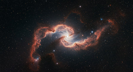 A starry sky with a bright orange and blue star in the middle. The star is surrounded by a cloud of gas and dust