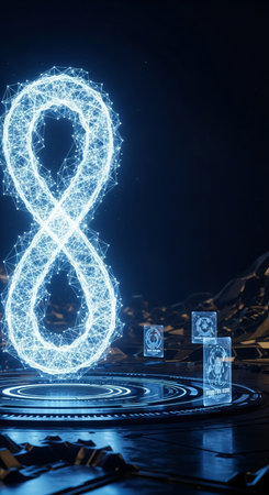 A solitary astronaut drifts through the dark expanse of space, enveloped by vibrant blue and pink neon light streaks that form a captivating infinity symbol, symbolizing endless possibilities and future innovation.
