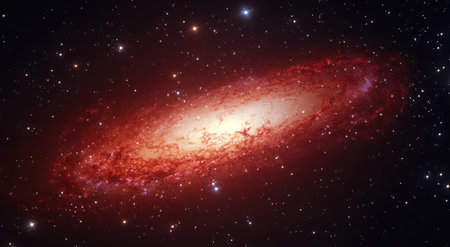 Orange galaxy bright red light cosmic dust star field nebula deep space glowing core spiral arms awe