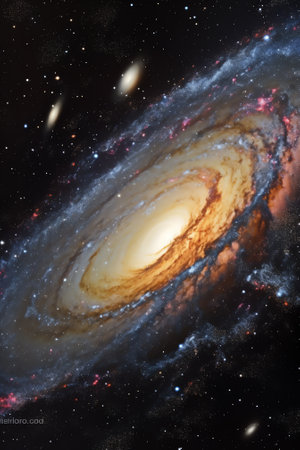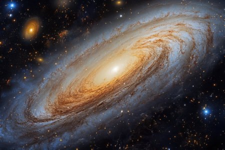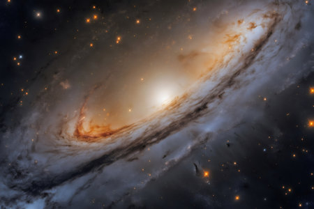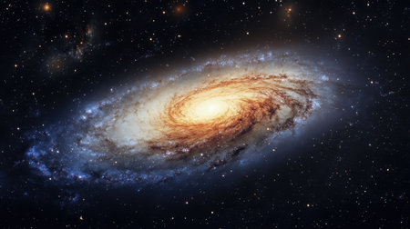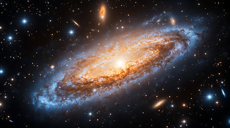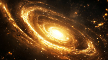 An image showcases a spiral galaxy with a radiant central core. The composition features swirling arms and a multitude of stars, exhibiting hues of orange, blue, and gold. The artwork evokes a sense of vastness and cosmic wonder, potentially suitable for educational or illustrative purposes.