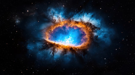 A blue and orange nebula in space. The blue is the color of the sky and the orange is the color of the sun