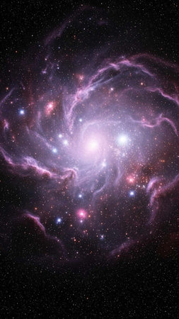 Stunning spiral galaxy with vibrant purple and pink nebulae in deep space.