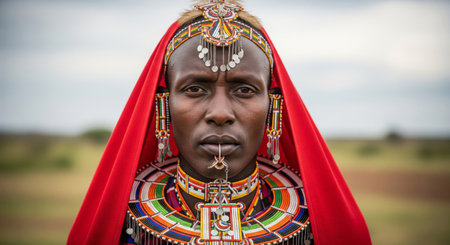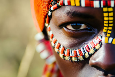 Bold close up of a Maasai warrior's face adorned with colorful traditional beads and headdress, showcasing the rich cultural heritage of the Maasai people