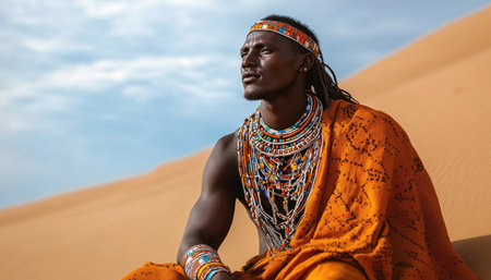 Portrait of an african man wearing traditional clothes and looking away in the desert