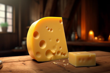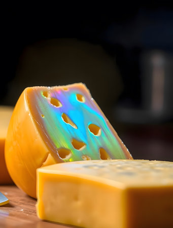 A whimsical illustration showcases texture-rich yellow cheese on an eco-friendly background as a naturally sourced dairy product within a fantastical world of digital artistry