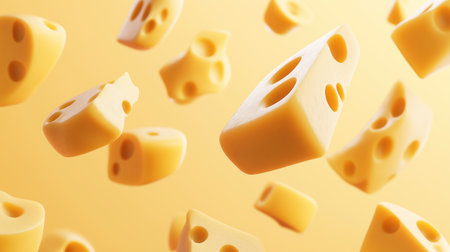 Multiple cheese cubes hover against a clean white background, creating a playful and appetizing food concept Perfect for illustrating healthy eating or culinary themes.