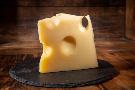 Cheese collection, piece of Swiss medium-hard yellow cheese emmental with holes close up