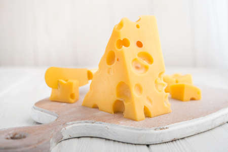 Pieces of yellow cheese with large holes on a white background. Delicious cheese close-up. Closeup on soft yellow backdrop. Vegetarian food.