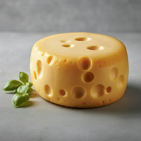 A visually striking yellow cheese block with holes sits against a neutral background, perfect for culinary projects and food-themed designs.