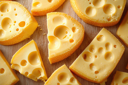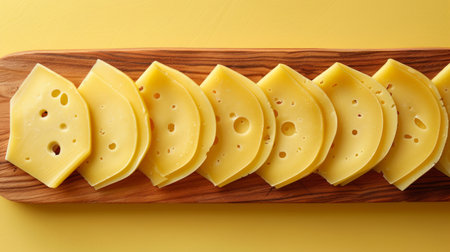 Slices of maasdam cheese on olive wood cutting board against yellow background. Mild flavor with holes, ready to enjoy