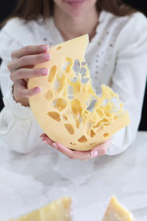 The girl holds large chunks of hard maasdam cheese. Cheese with lots of holes. Dutch Maasdamer cheese. An unrecognizable person.Chunks of cheese are out of focus. Vertical photo.