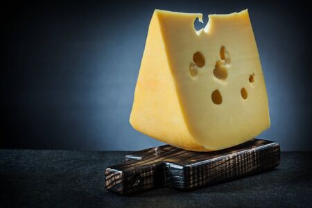 single big piese of cheese on small vintage wooden kitchen chopping board and black gradient background