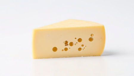 A yellow Swiss cheese block with iconic holes sits on a white backdrop suggesting culinary use for food photography and recipe illustrations.