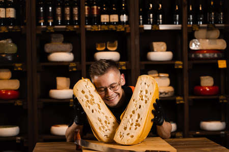 2 half of yellow cheese wheel limited maasdam natural aged. Cutting cheese in store. Big pieces of cheese. Sommelier holding cheese
