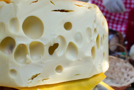 Cheese collection, blocks of French Emmentaler cheese with many round holes made from cow milk close up