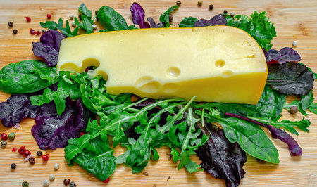 Large piece of cheese on pillow of green and purple lettuce leaves on wooden board, sprinkled with colored pepper. Image for restaurant menu. Healthy food concept.