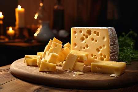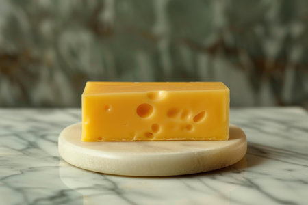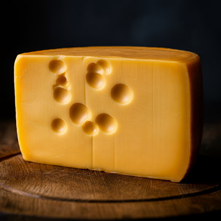 Close-up of cheese block featuring distinctive holes and a gourmet aesthetic ideal for food-related content such as restaurant marketing.