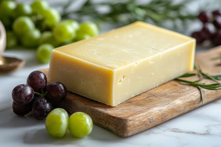 A block of yellow cheese is placed on a wooden cutting board. Beside it, a cluster of purple grapes and green leaves create a refreshing, appetizing display.