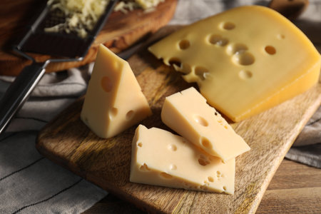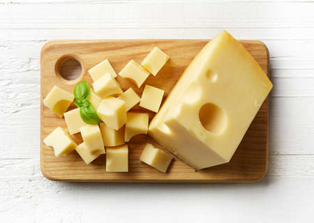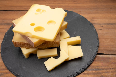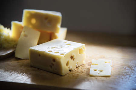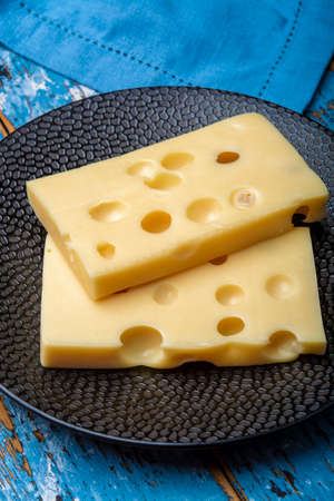 Cheese collection, blocks of French Emmentaler cheese with many round holes made from cow milk close up