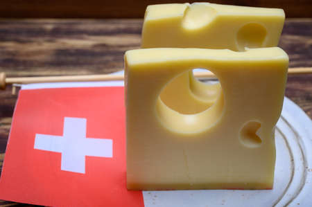 Cheese collection, swiss emmentaler cheese with big holes and flag of Switzerland close up