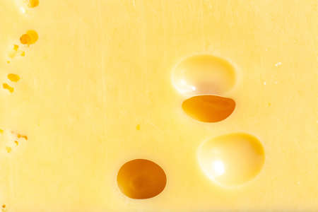 Emmental cheese texture close up. Macro Swiss yellow cheese with holes background