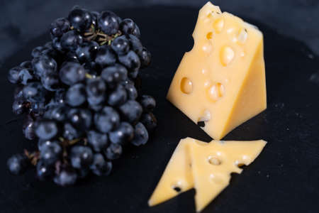 Aged English cheddar and old Dutch cheese, the most popular type of hard cheeses made from cow milk served as a dessert with nuts and grapes