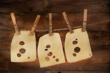 Thin Slices of Swiss Cheese on Wooden Background Top View and Flat Lay. Natural Rustic Backdrop with Place for Text