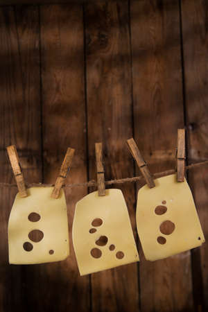 Cheese collection, one piece of three years old dark yellow hard Dutch cheese in sun lights