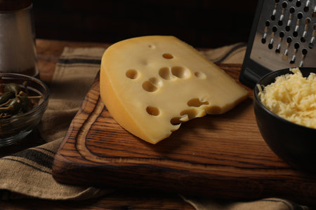Large wedge of semi soft part-skim swiss cheese on a dark wooden background.