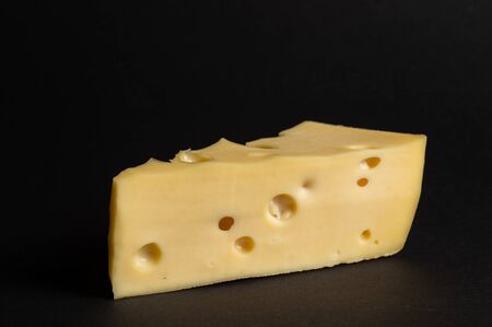 A piece of hard cheese with large holes on a black background. Yellow piece of cheese close-up.