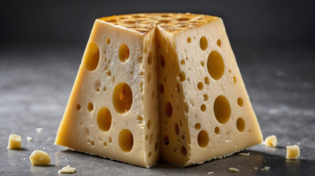 Two triangular slices of cheese with many holes sit on a dark surface perfect for culinary or food blog content.