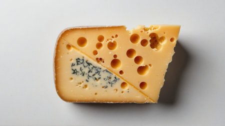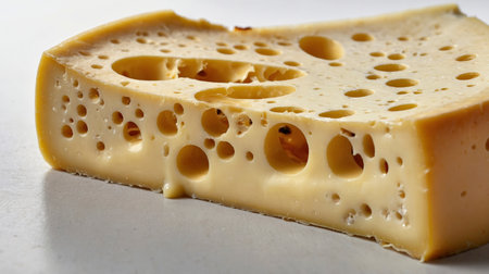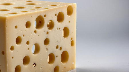 Appetizing close-up of a chunk of swiss cheese with distinctive holes against a plain background for culinary-themed projects.