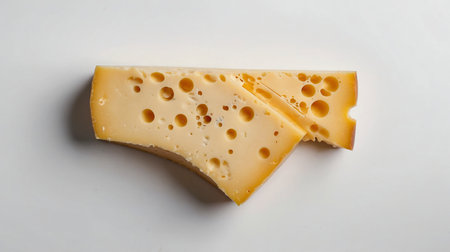 Two pieces of Swiss cheese with characteristic holes are placed on a white background and are ready to be enjoyed in a snack or meal.