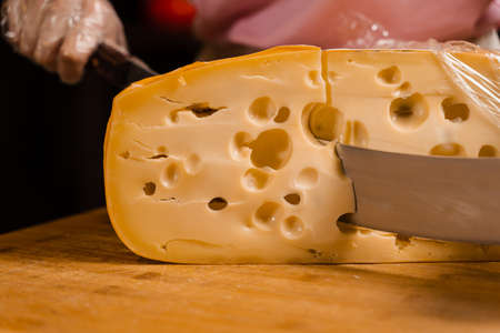 Cutting limiited maasdam natural aged cheese with knife. Cutting cheese in store. Snack tasty piece of cheese for appetizer