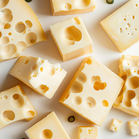 A collection of Emmental cheese slices showcasing unique holes and textures, perfect for culinary creations or enhancing any cheese platter.