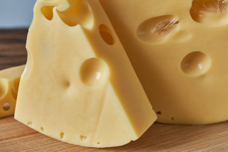 A detailed shot of appetizing Swiss cheese highlights its texture and unique hole pattern making it perfect for culinary projects.