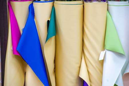 Colorful upholstery fabric samples in the store. Types Of Fabrics.