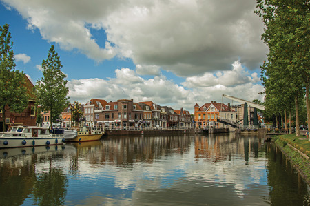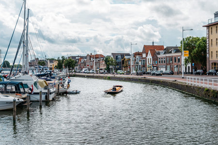 Alkmaar, Netherlands - August 5, 2016: Canal of Alkmaar with nautical vessels and cityscape a cloudy day. Alkmaar is well known for its traditional cheese market. For tourists, it is a popular cultural destination