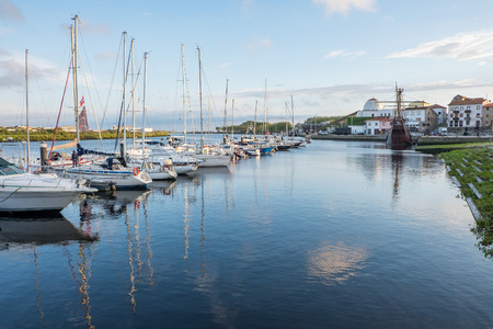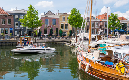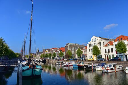 Goes, Netherlands - August 6 2016: Sailboats docked in the center of Goes, a town in Zeeland, the Netherlands